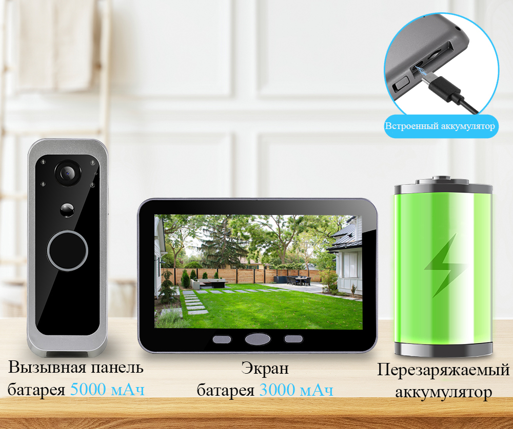 Монитор и вызывная панель оснащены встроенными перезаряжаемыми аккумуляторами. Время работы зависит от частоты использования устройства и движения перед ним. В режиме ожидания время работы вызывной панели может составлять до 1 месяца. При  регулярном использовании экран рекомендуется подключать к постоянному питанию от розетки, аккумулятор служит лишь для редкого использования.