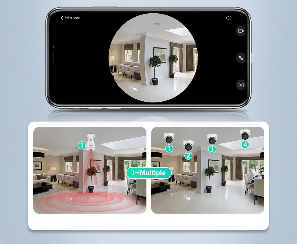 Беспроводная WIFI камера кругового обзора с матрицей 3Мп отлично подойдет для организации видеонаблюдения небольшого объекта площадью до 20-30 квадратных метров. Благодаря встроенной ИК-подсветке вы сможете видеть изображение до 10 метров в условиях полного отсутствия освещения, просматривая удаленно видео из любой точки мира со смартфона. Камера подключается по сети WIFI. Просмотр осуществляется через мобильное приложение TuyaSmart или SmartLife. Круговой обзор позволяет заменить несколько статичных камер.